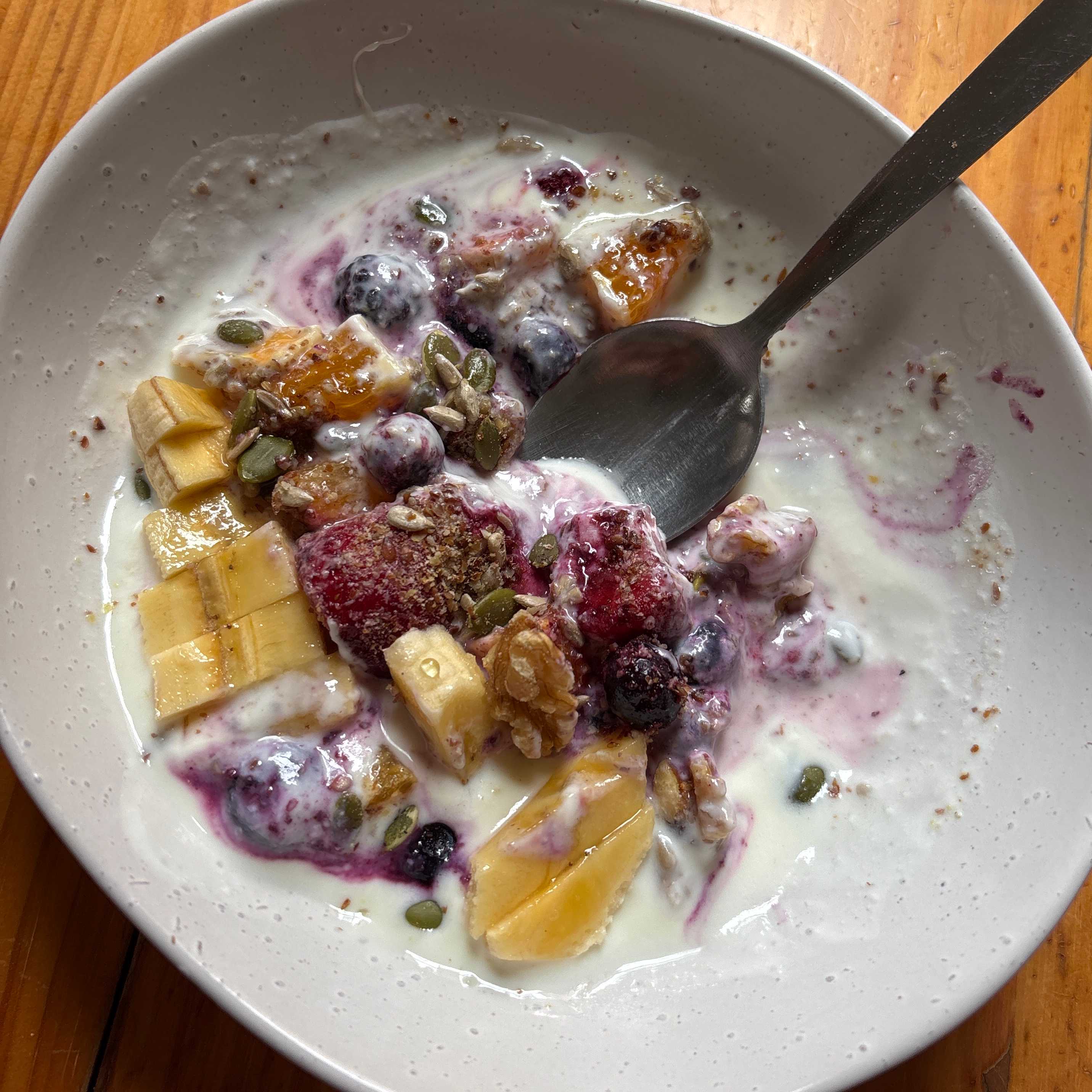 A quick, nutritious, and energizing breakfast bowl featuring creamy yogurt topped with fresh banana chunks, berries, and a crunchy mix of walnuts and pumpkin seeds. Perfect for a healthy start to the day.