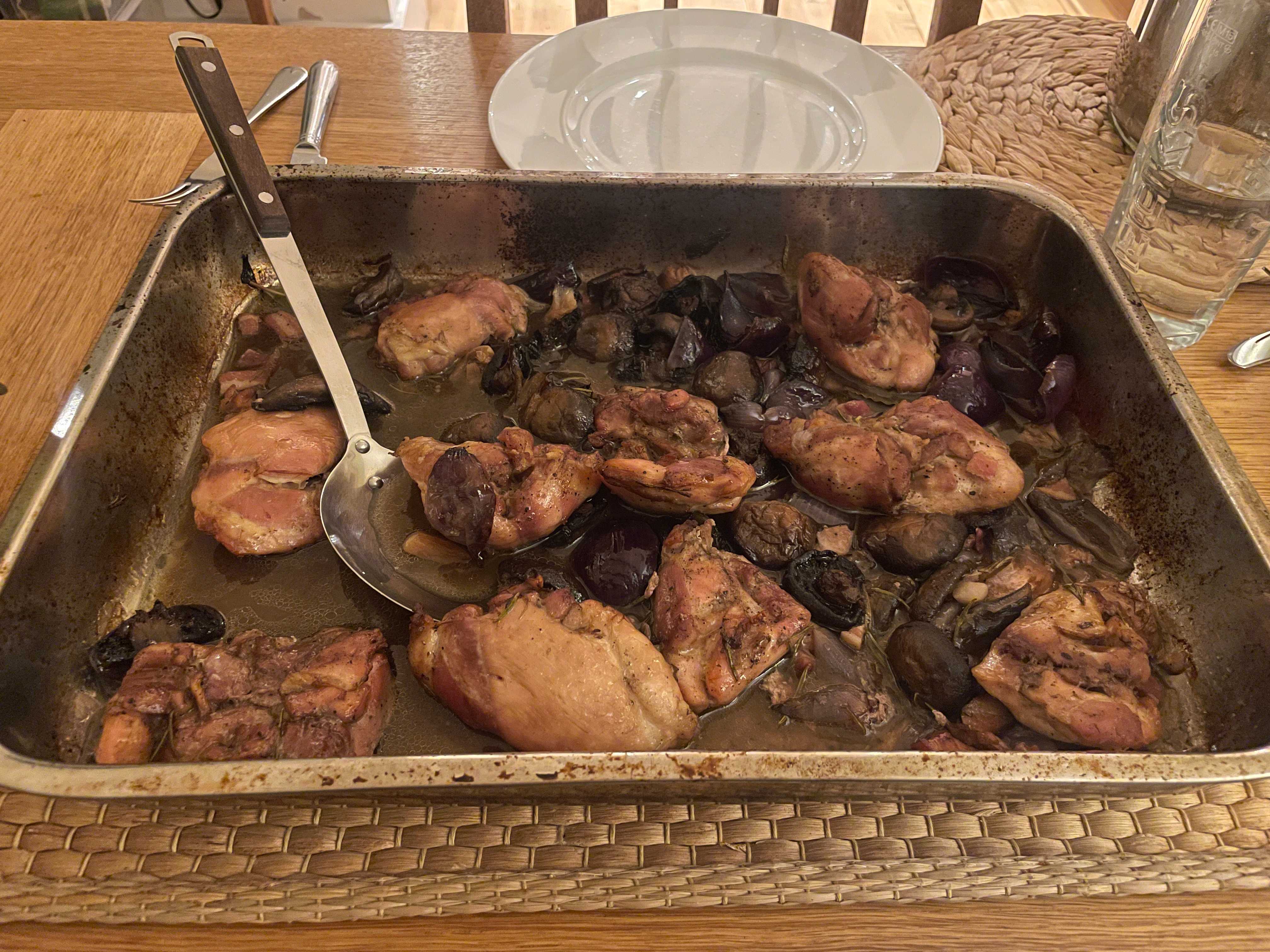 A rustic, one-pan twist on the French classic Coq au Vin, swapping red wine for dry cider. This 'Coq au Cider' features golden, crispy-skinned chicken thighs roasted alongside tender red onions, earthy mushrooms, and savory bacon lardons. The cider reduces in the oven to create a rich, slightly sweet, and tangy sauce. Based on the photos, this dish pairs perfectly with creamy mashed potatoes and steamed greens.