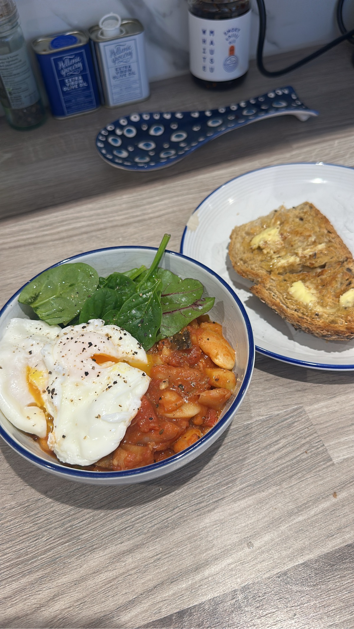 My life’s been changed. The never ending butter bean thing, spiced up with poached eggs