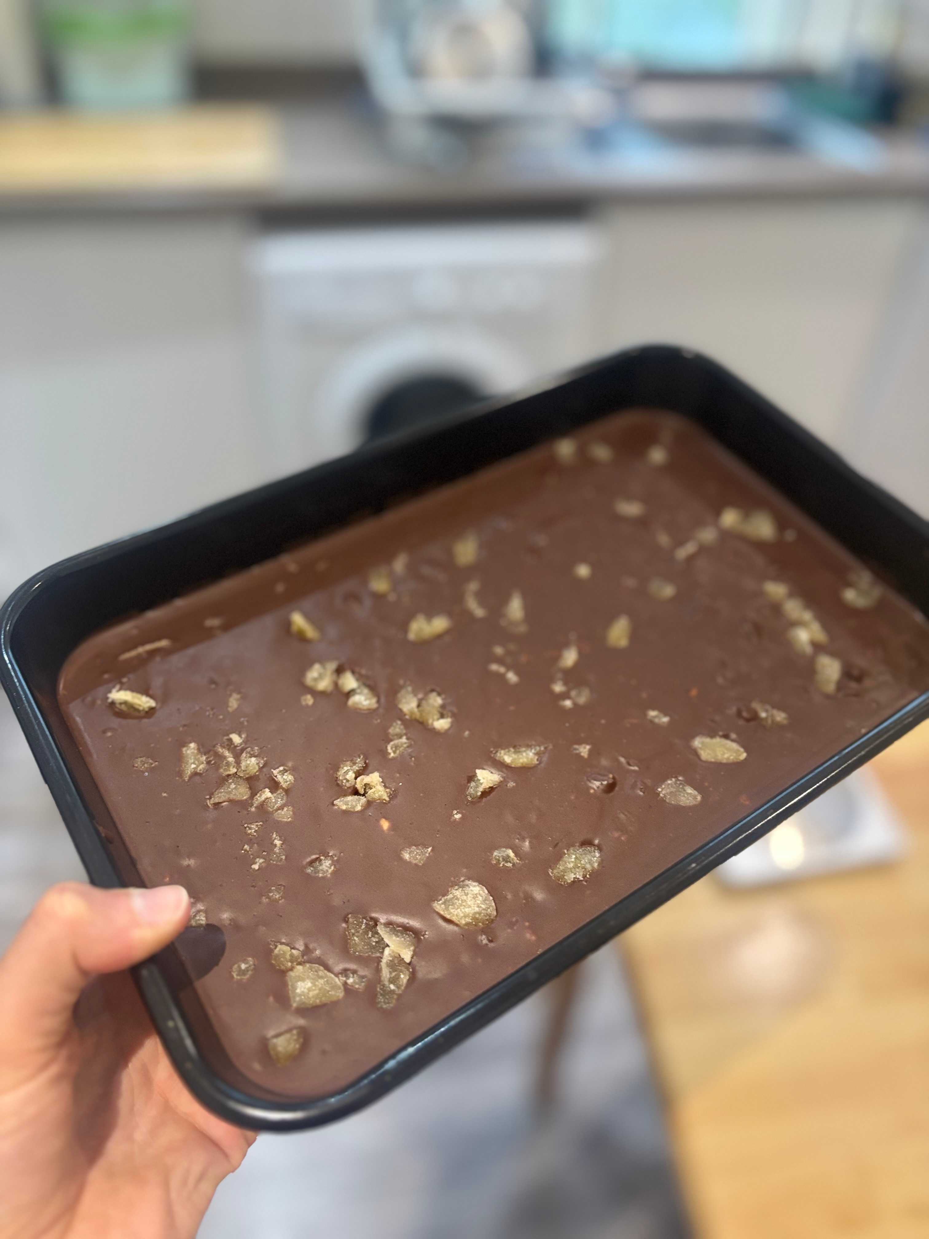 A rich and silky chocolate treat that combines the depth of dark chocolate with the creaminess of almond butter and the warming spice of stem ginger. This no-bake recipe uses coconut oil for a melt-in-the-mouth texture and is topped with chopped stem ginger for a spicy crunch.