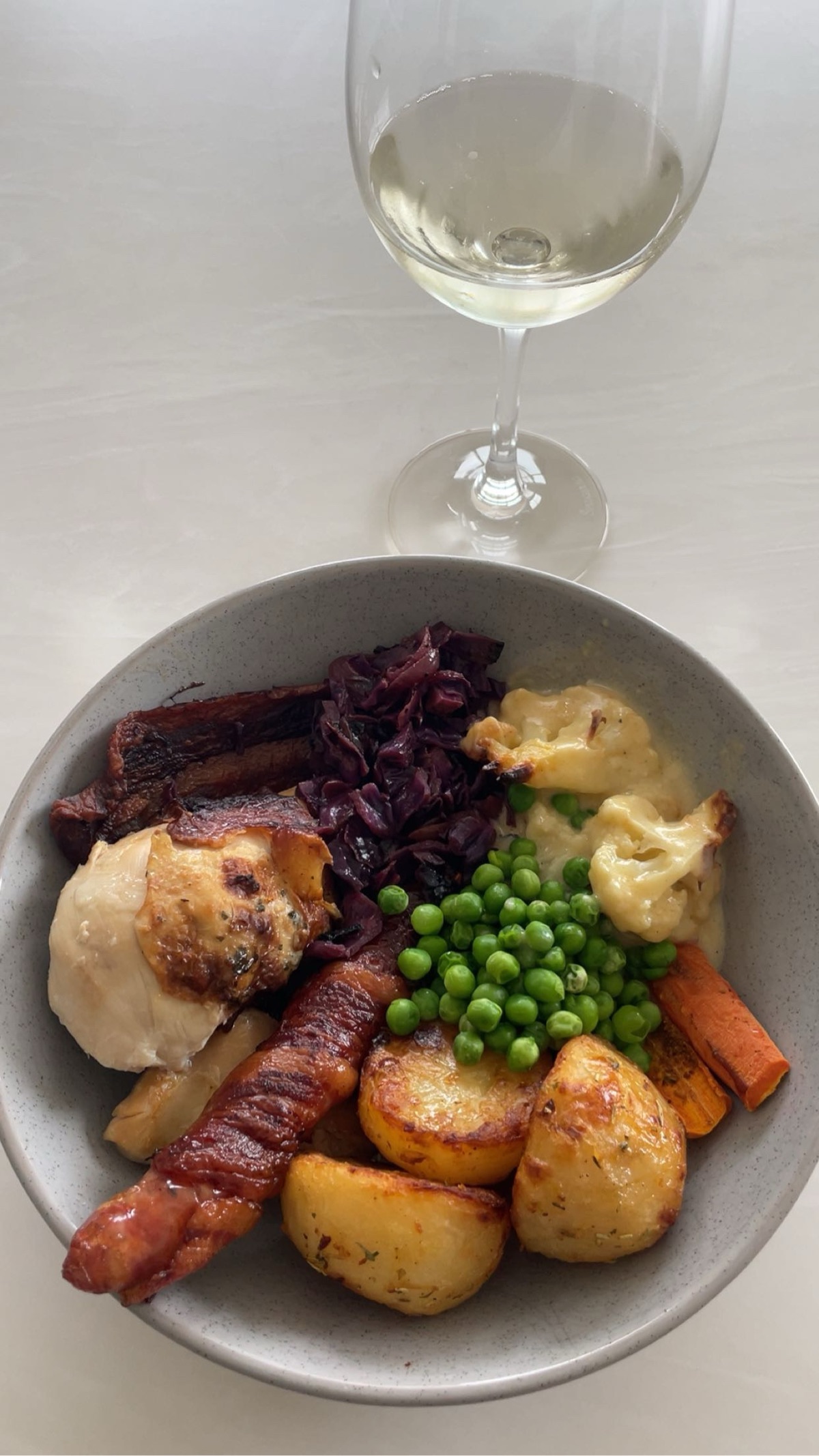 Lemon and thyme Roast chicken, pigs in blankets, Rosemary roast potatoes, harissa roasted carrots, cauliflower cheese, cider braised red cabbage. Cranberry sauce and chicken juice gravy added after.