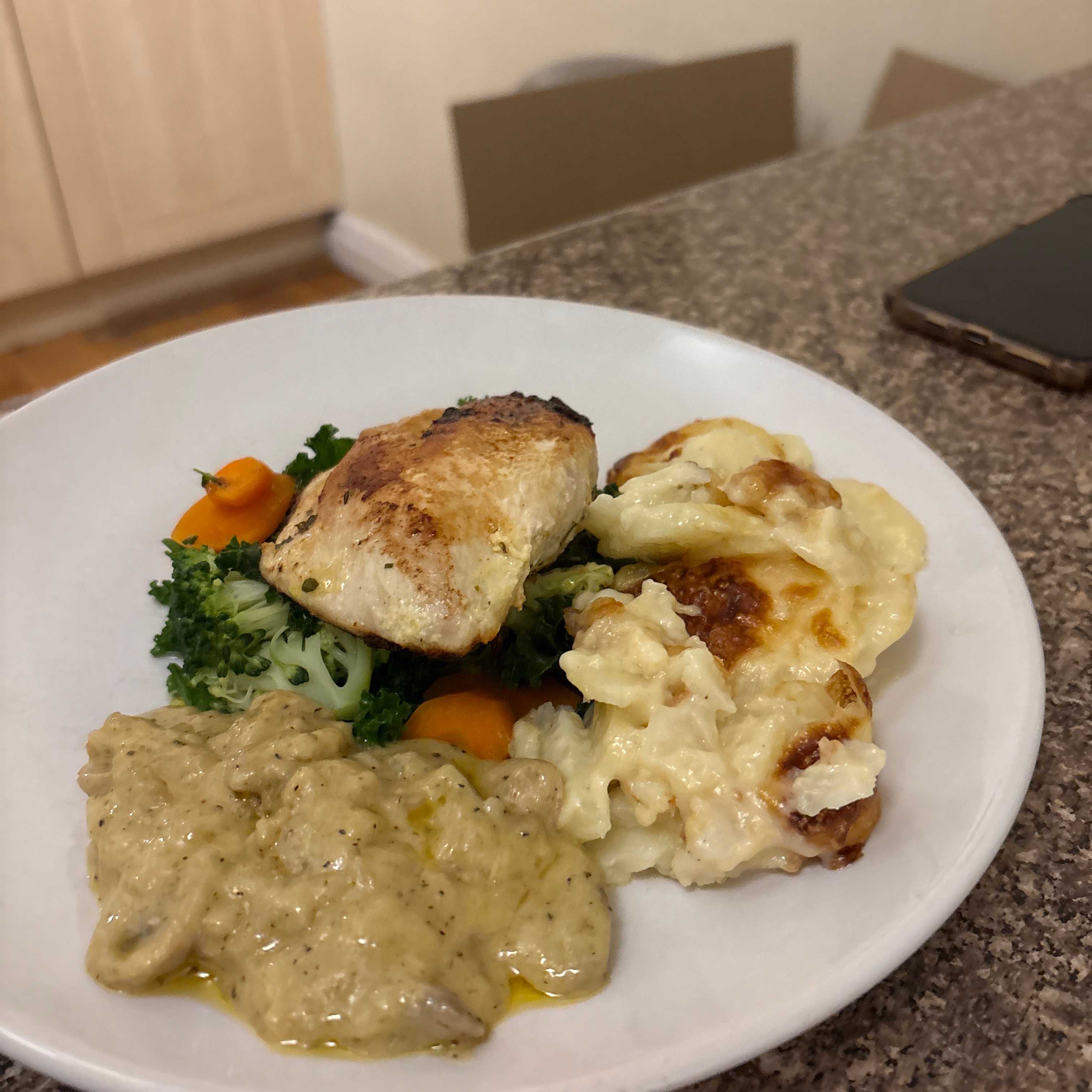 A comforting bistro-style dinner featuring juicy pan-fried chicken breast served alongside rich, creamy scalloped potatoes (dauphinoise), simple steamed vegetables, and a luxurious creamy peppered mushroom sauce.