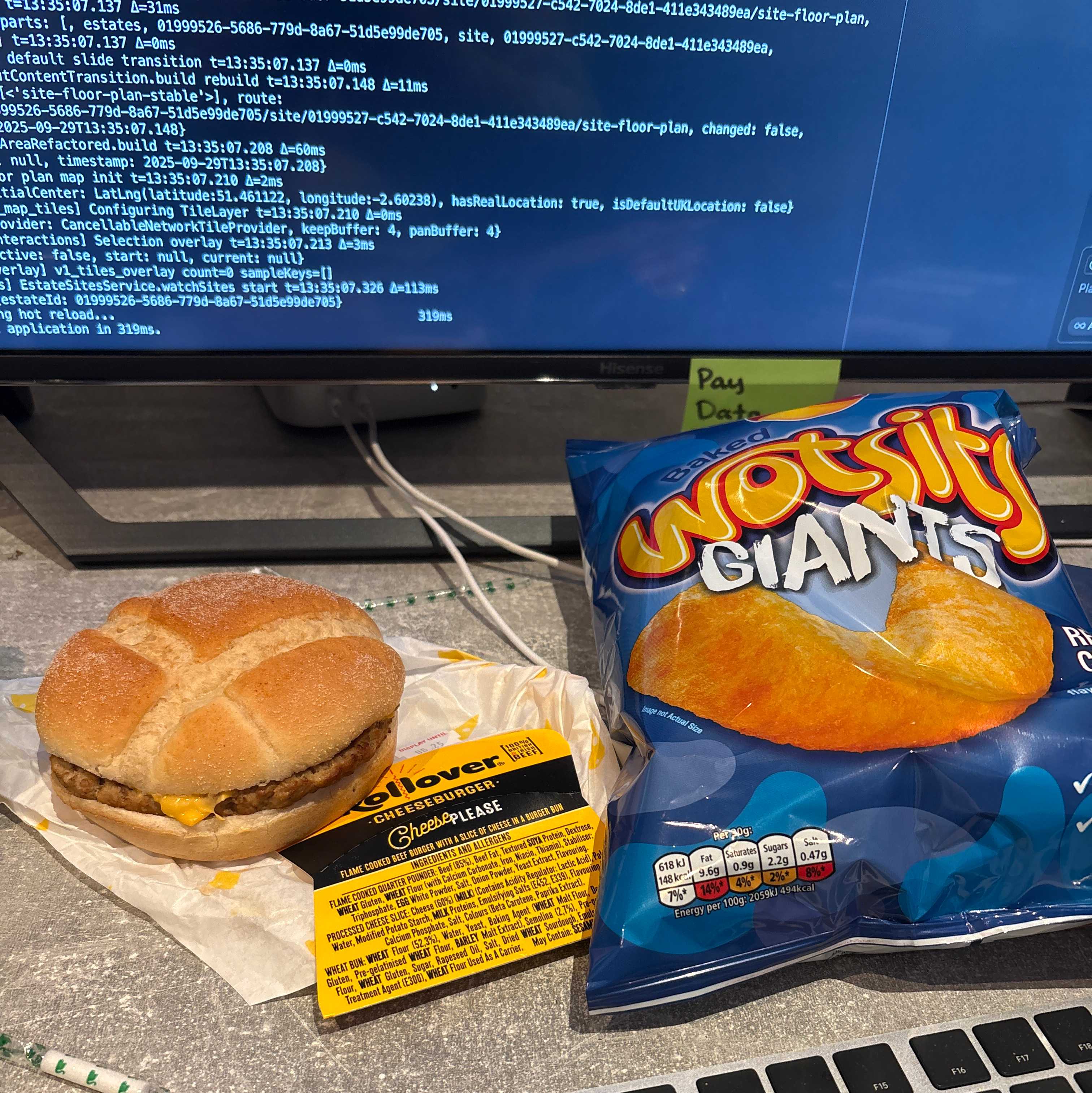 Inspired by the 'Rollover' cheeseburger and Wotsits Giants in the image, this is an upgraded homemade version of the classic developer's deadline meal. It features a juicy, fresh beef quarter pounder, that essential slice of melting American cheese ('plastic cheese'), and a soft bun, served alongside a pile of savory giant cheese puffs. It's quick, satisfying comfort food perfect for powering through coding sessions.