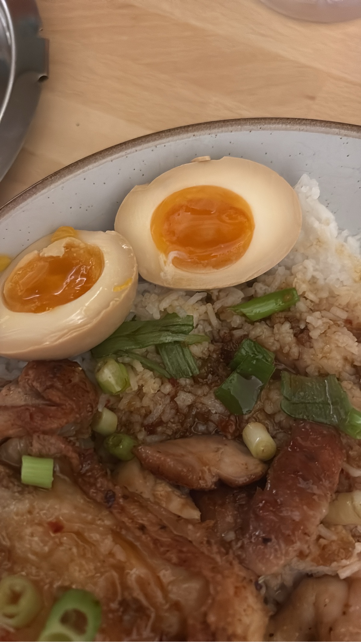 A comforting and savory Korean rice bowl (Dak-deopbap) featuring tender chicken thighs glazed in a sweet and salty soy sauce mixture. It is served with a 'Mayak' egg (drug egg)—a famous Korean side dish where soft-boiled eggs are marinated in a soy-based sauce until they develop a rich flavor and golden color. This dish is finished with fresh scallions and sesame oil.