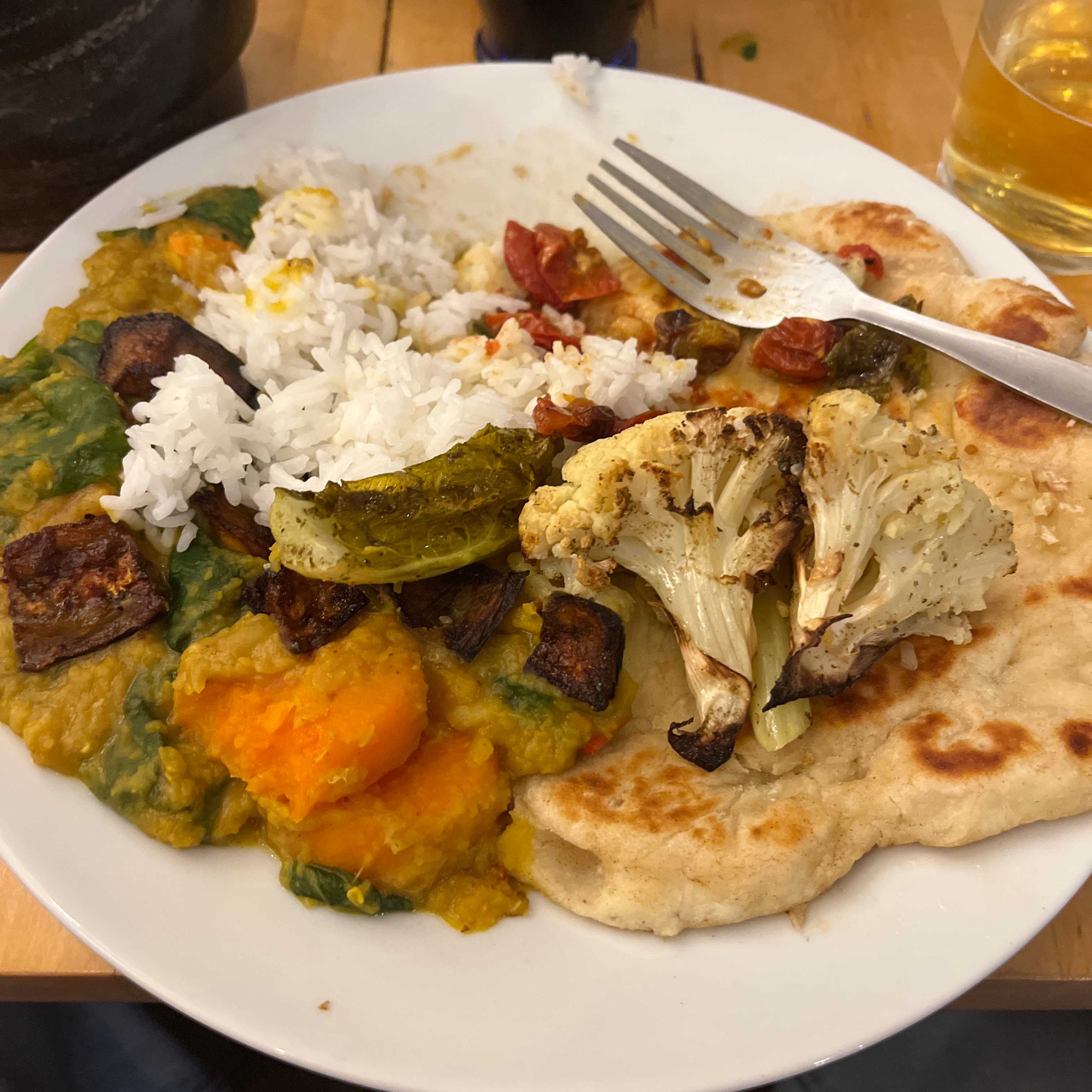 A vibrant and hearty vegetarian feast featuring creamy red lentil and sweet potato dhal, served alongside crispy honey-glazed aubergine, roasted za'atar cauliflower, savory miso cabbage, and burst cherry tomatoes. Perfect for sharing with rice and garlic naan.
