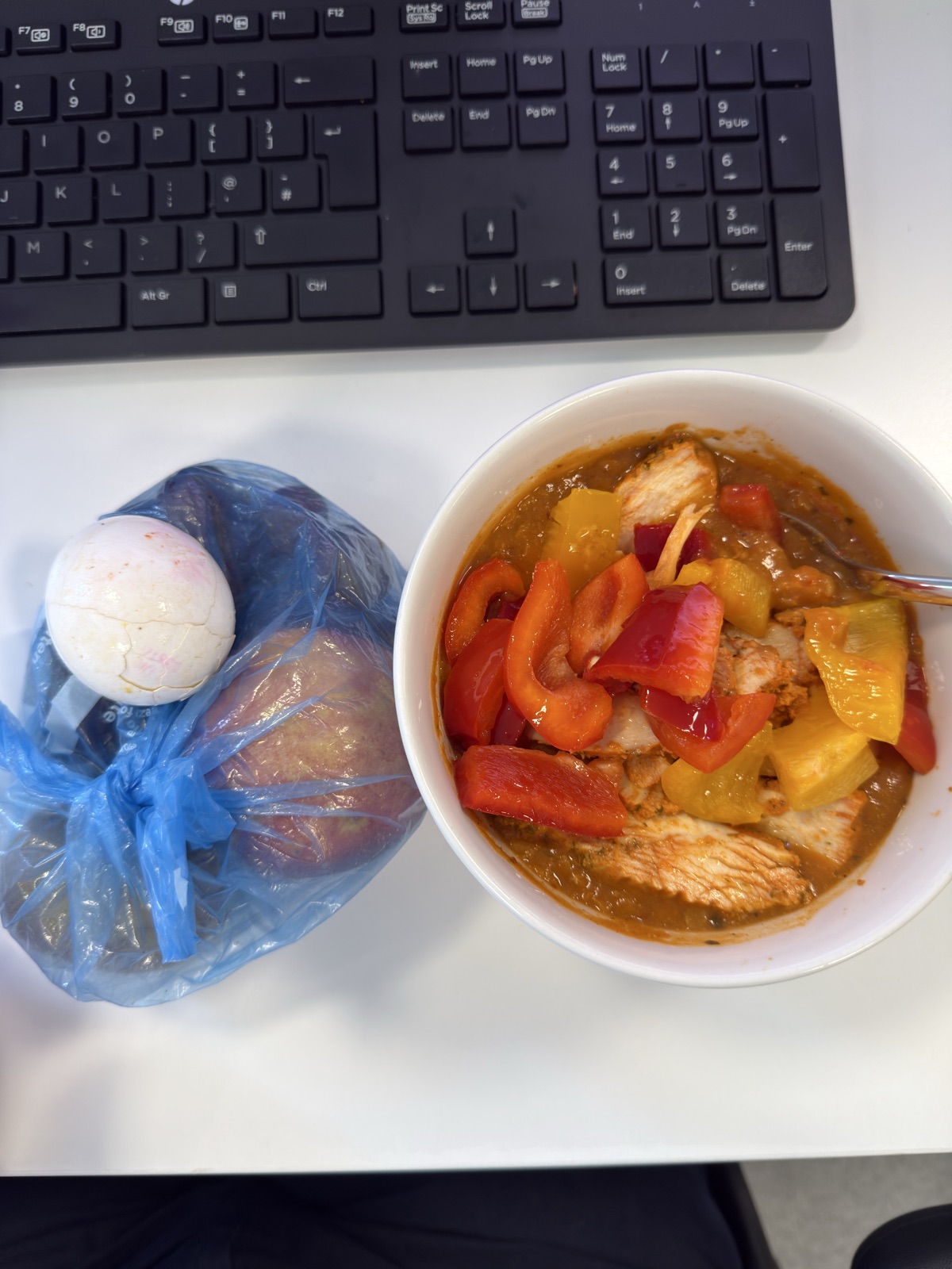 Pepper chicken soup I made and egg and fruit bag