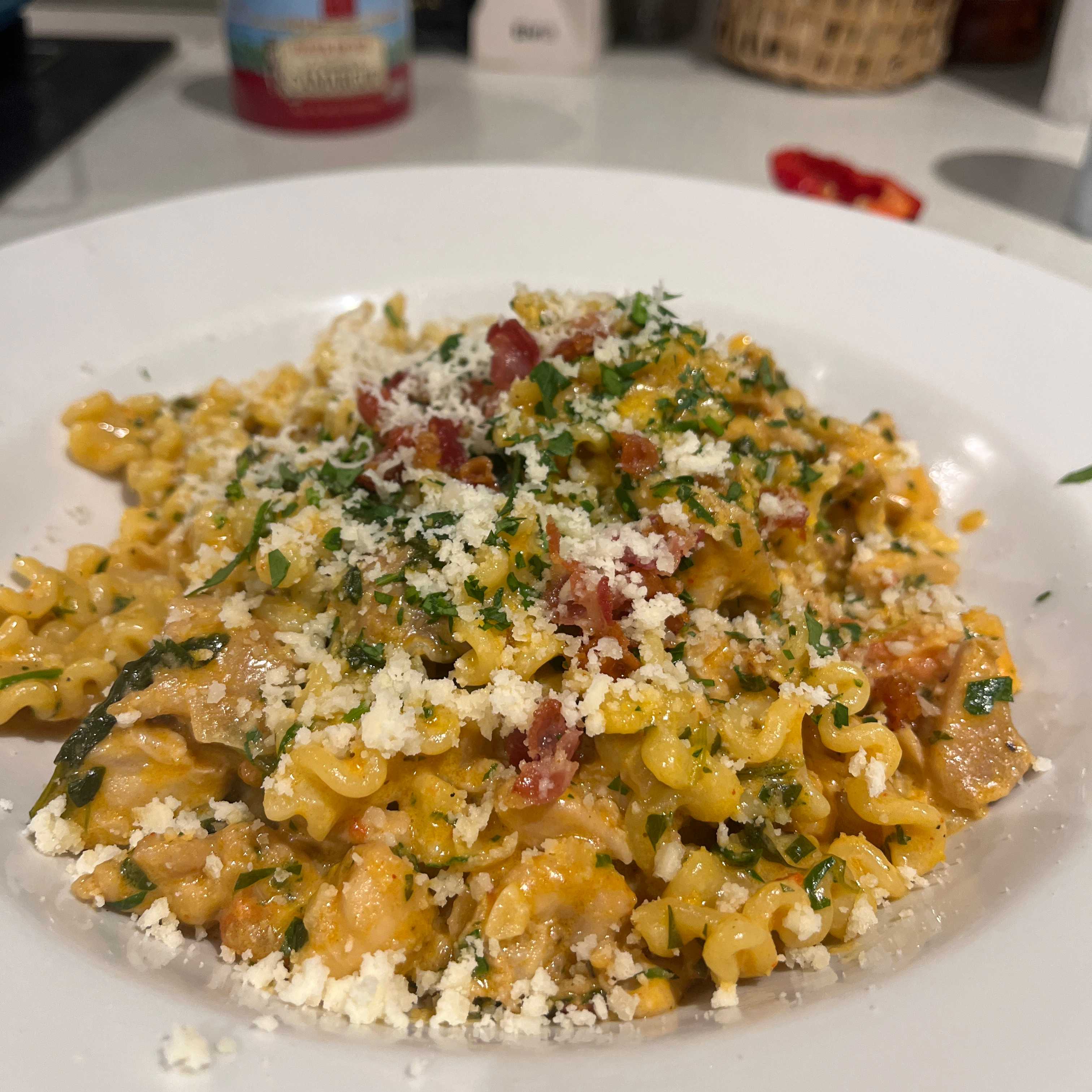 A rich and comforting pasta dish featuring ruffled mafalda corta noodles coated in a luscious, creamy tomato sauce. This recipe combines tender pieces of chicken with savory aromatics, finished with a generous dusting of parmesan cheese and fresh herbs. The sauce has a vibrant orange hue, suggesting a perfect balance of tomato acidity and rich cream.