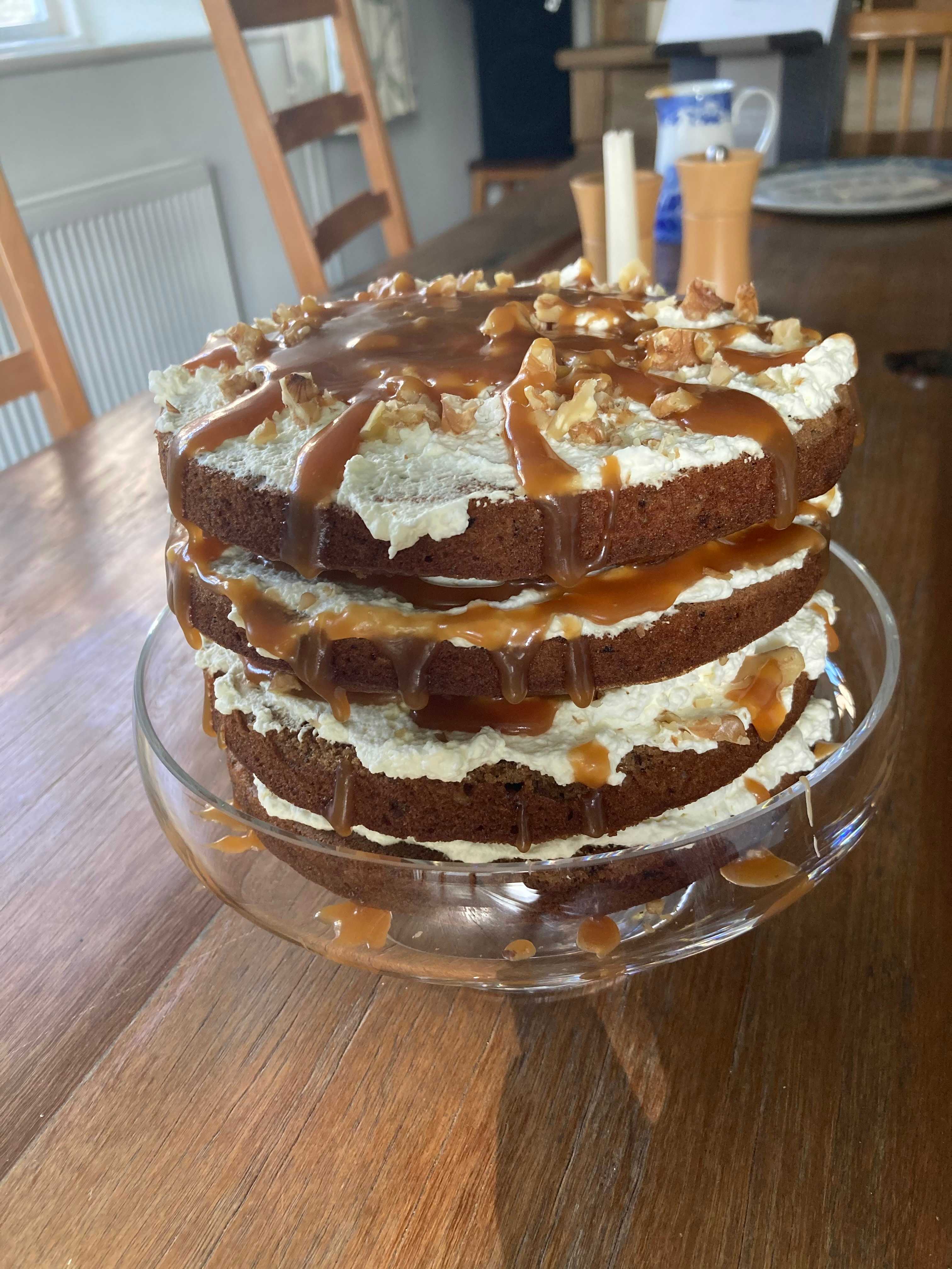 A show-stopping twist on the classic British dessert. This towering four-layer cake features moist, date-sweetened sponges with the signature flavor of sticky toffee pudding. It is layered with a light vanilla buttercream to balance the richness, heavily drizzled with homemade salted toffee sauce, and topped with crunchy walnuts. Perfect for celebrations, this cake is 'fun yet hard' as described, requiring patience to bake and assemble but offering an incredible reward.