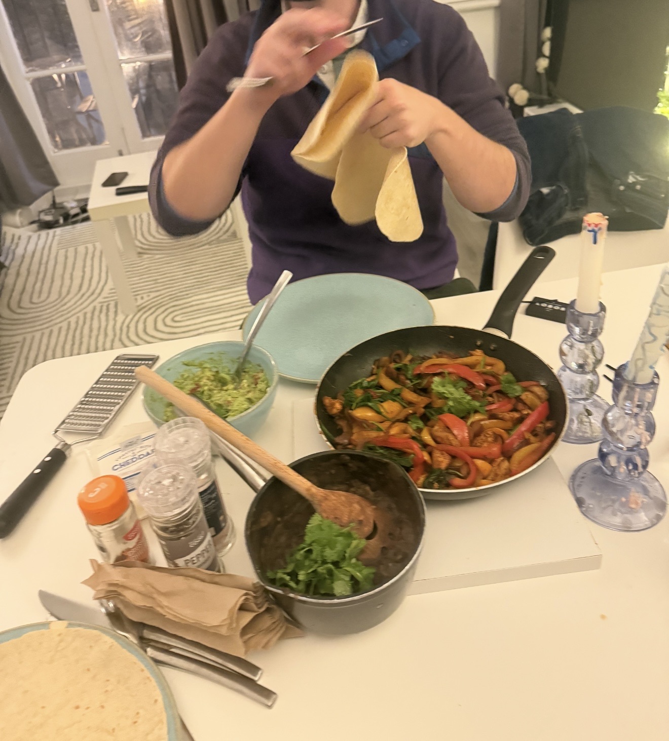 A vibrant Tex-Mex feast featuring pan-seared chicken strips tossed with colorful bell peppers and onions, served family-style directly from the skillet. Accompanied by a pot of hearty, cilantro-topped black beans, fresh homemade guacamole, and warm flour tortillas for a fun, build-your-own dinner experience.