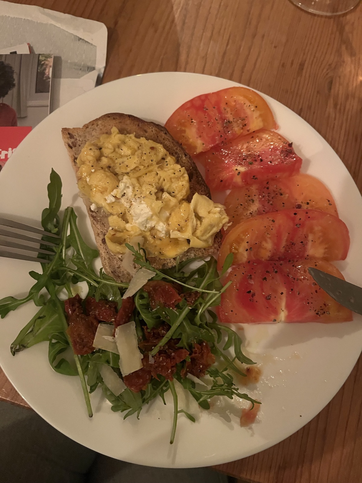 goat cheese soft scrambled eggs, steak tomato with extra virgin olive oil, rocket slow roasted cherry tomatoes and parm