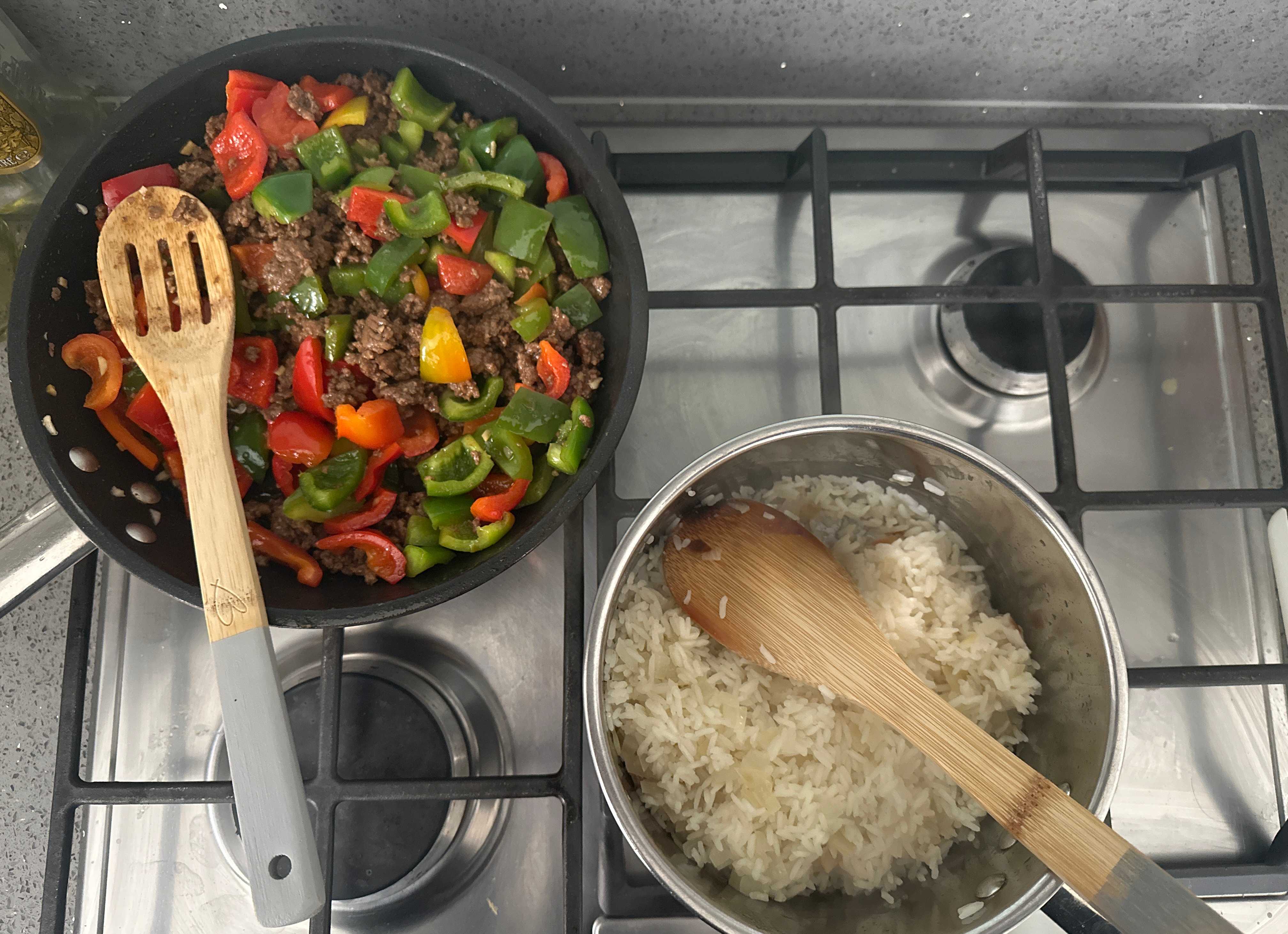 A quick, savory, and budget-friendly weeknight dinner featuring browned ground beef and colorful bell peppers tossed in a sweet and sticky garlic-ginger soy glaze. Finished with a generous sprinkle of toasted sesame seeds and served directly from the pan over fluffy white rice.