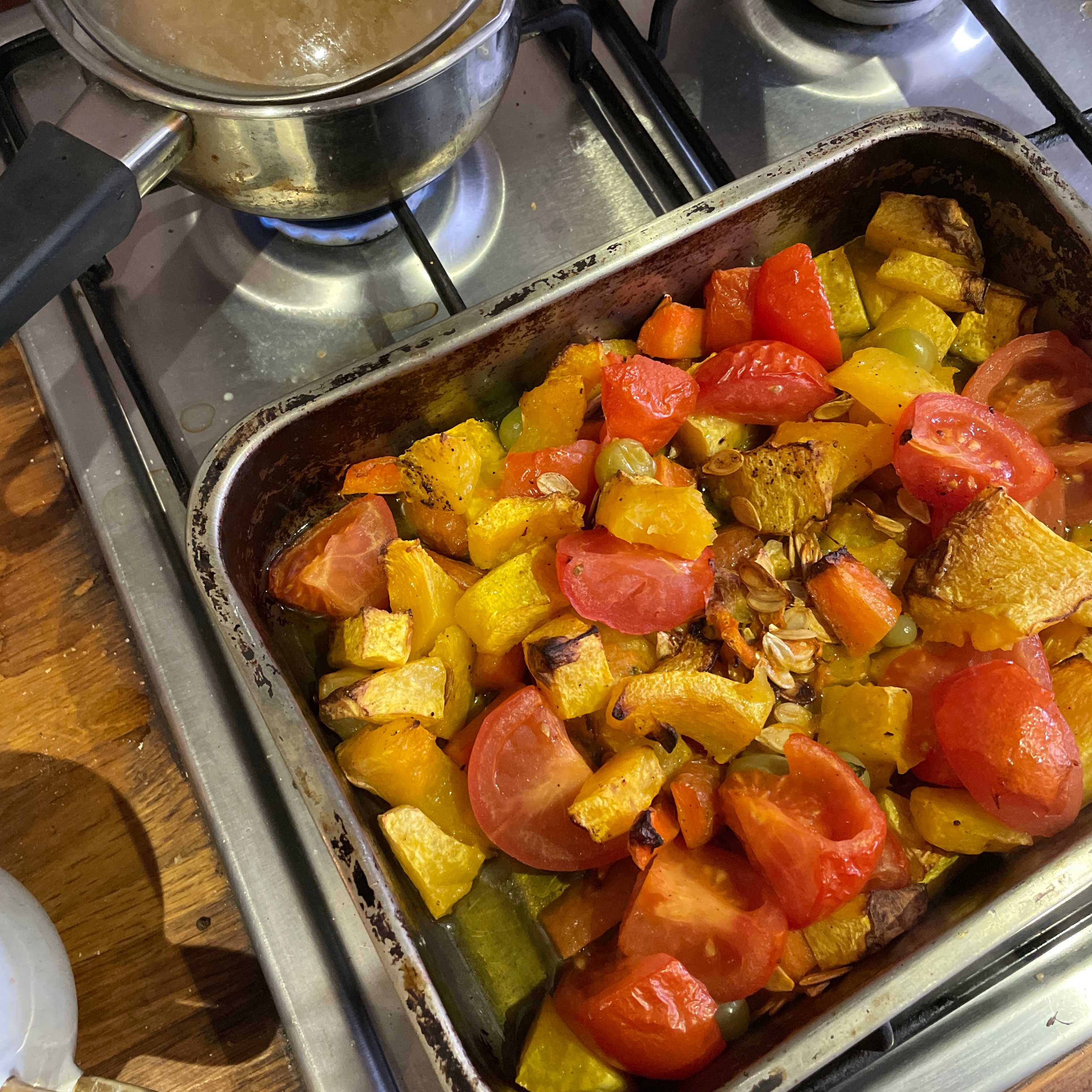 A deeply comforting and wholesome meal featuring a velvety soup made from caramelized roasted butternut squash, homegrown tomatoes, and protein-rich lentils. Served alongside a fresh, hearty loaf of homemade whole wheat bread.