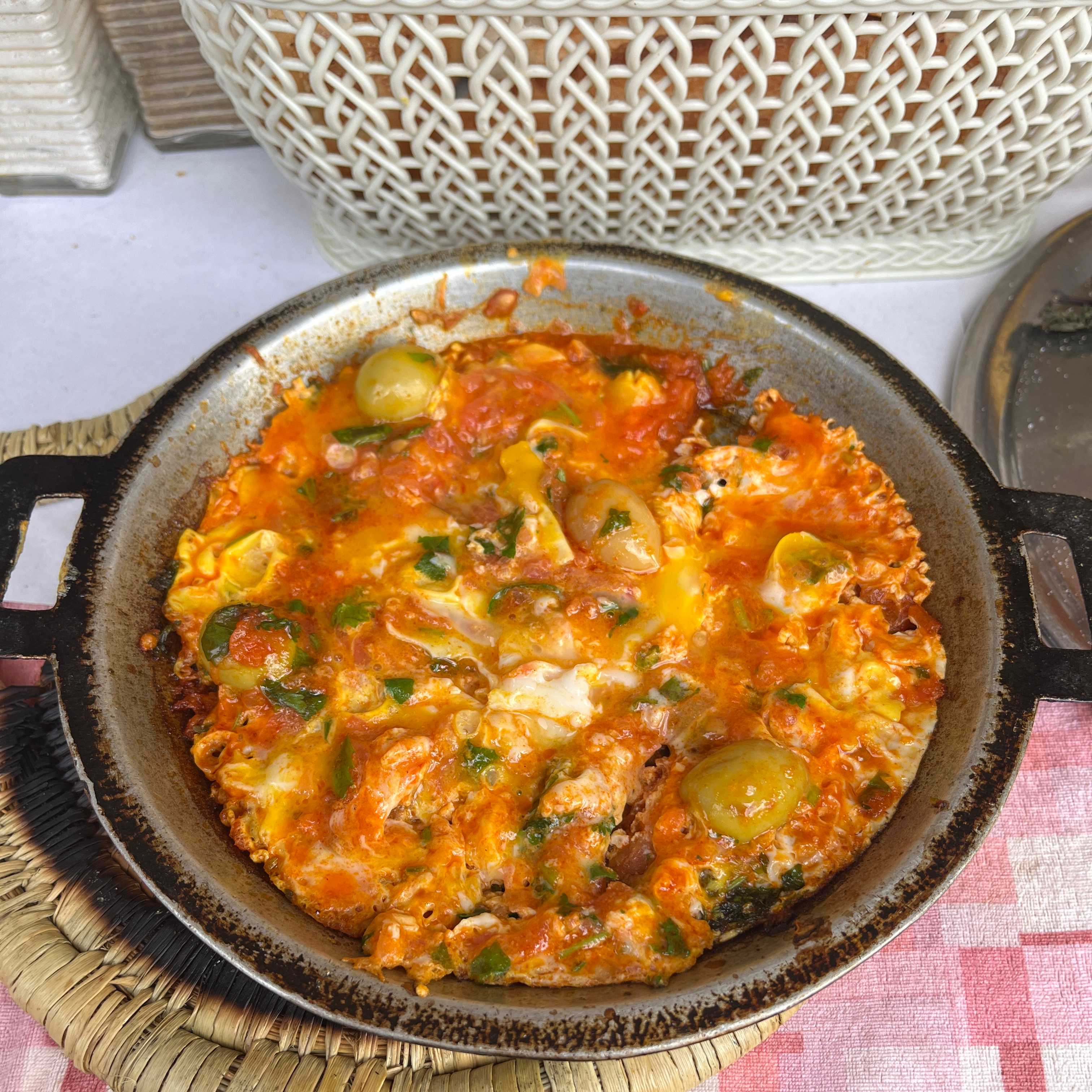 Based on your image and description, this is a classic Omelette Berbère—a staple Moroccan dish often served for breakfast or lunch. Unlike a French omelette, the eggs are cooked directly into a rich, spiced tomato and onion sauce (similar to a Shakshuka but the eggs are typically beaten or mixed in more thoroughly) and studded with green olives. It is traditionally served in the pan it was cooked in, accompanied by crusty bread or khobz and sweet mint tea.