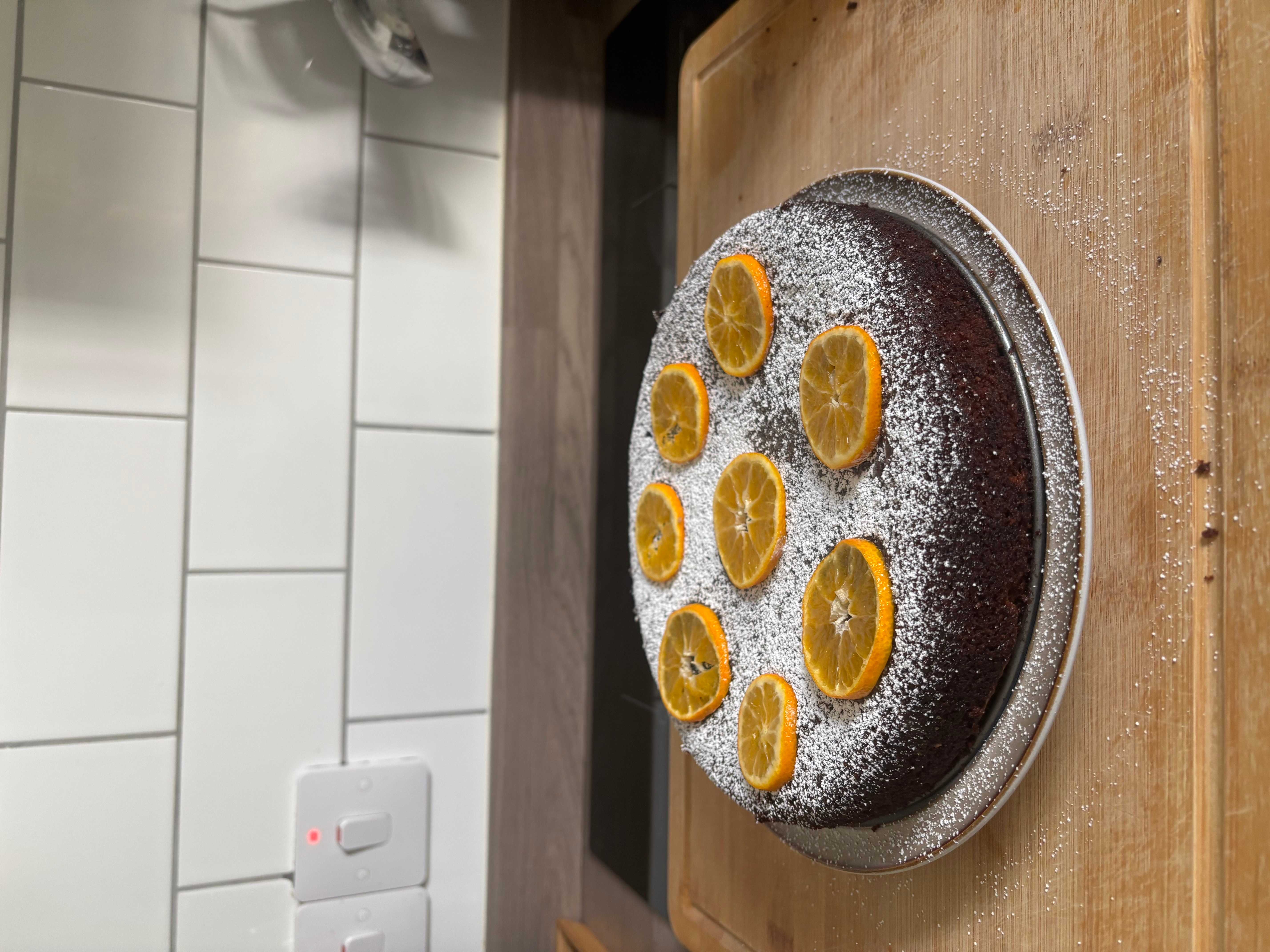 A dense, moist, and aromatic flourless cake perfect for a celebration breakfast or dessert. Made by boiling whole clementines and blitzing them into a pulp, this cake uses ground almonds instead of flour, resulting in a rich texture that happens to be gluten-free and dairy-free. Based on the user's specific recipe, topped with dried citrus slices and powdered sugar.