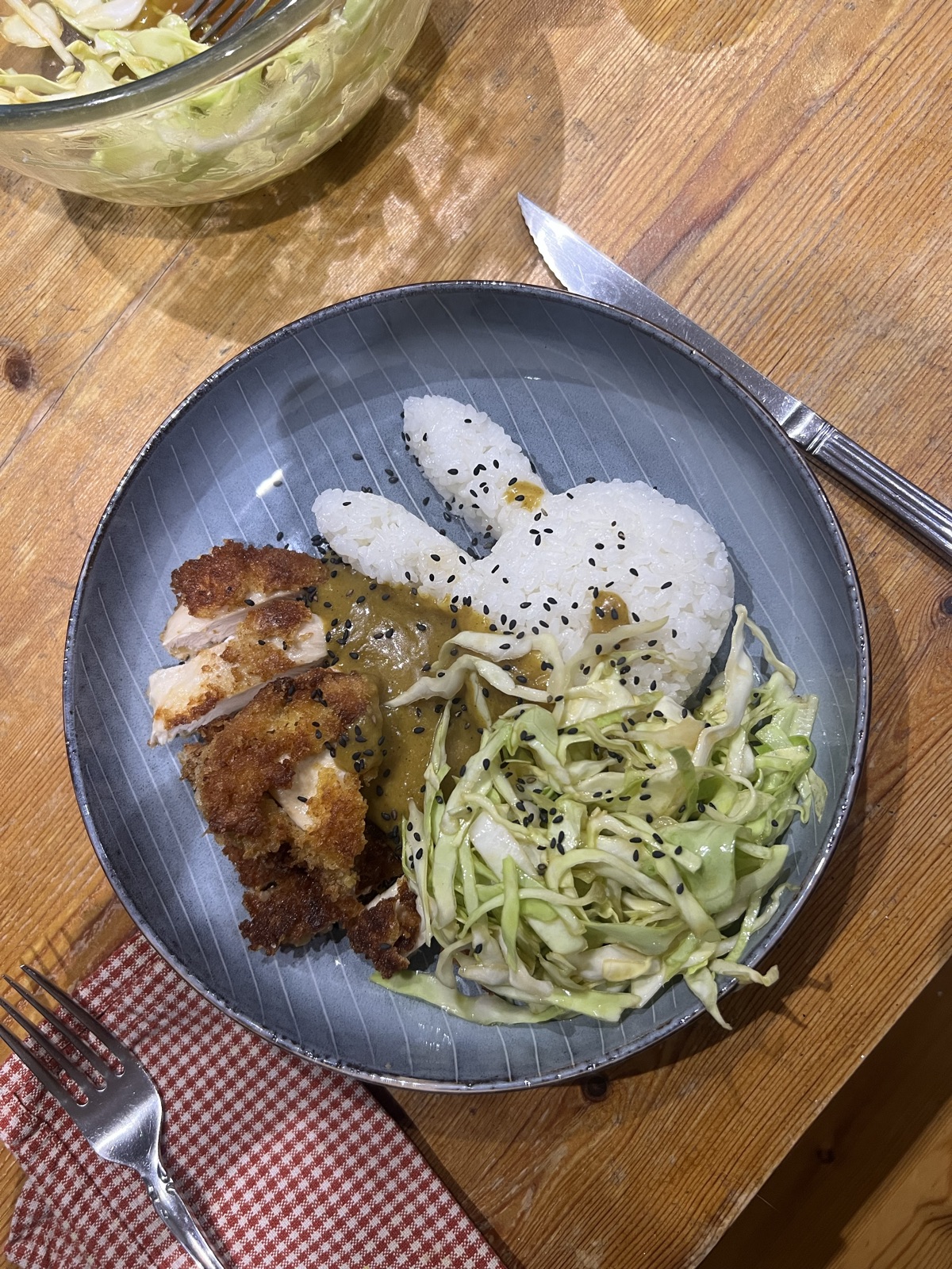 miffy rice shaper made its debut ft sesame cabbage salad cheated w wagamama katsu curry sauce but was not enough 🥲🥲🍛