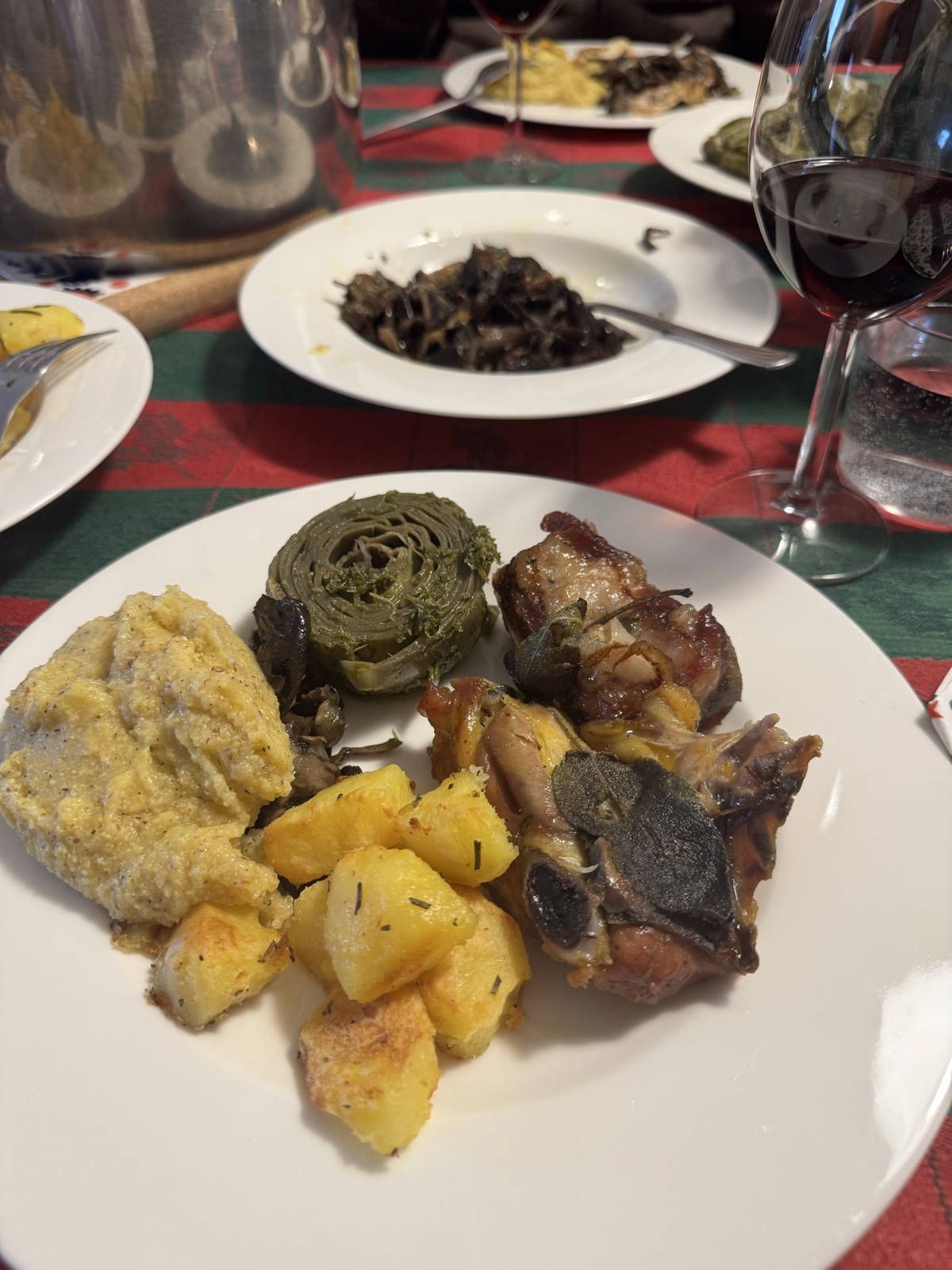 A traditional Italian 'Pranzo della Domenica' (Sunday Lunch) featuring tender chunks of pork roasted with fresh sage and white wine, served alongside creamy polenta, golden rosemary potatoes, and braised artichokes. This hearty combination captures the essence of rustic Italian home cooking.