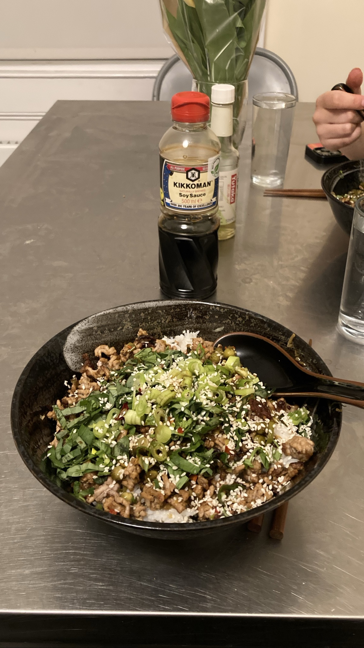 pork stir fry n rice with basil and peas