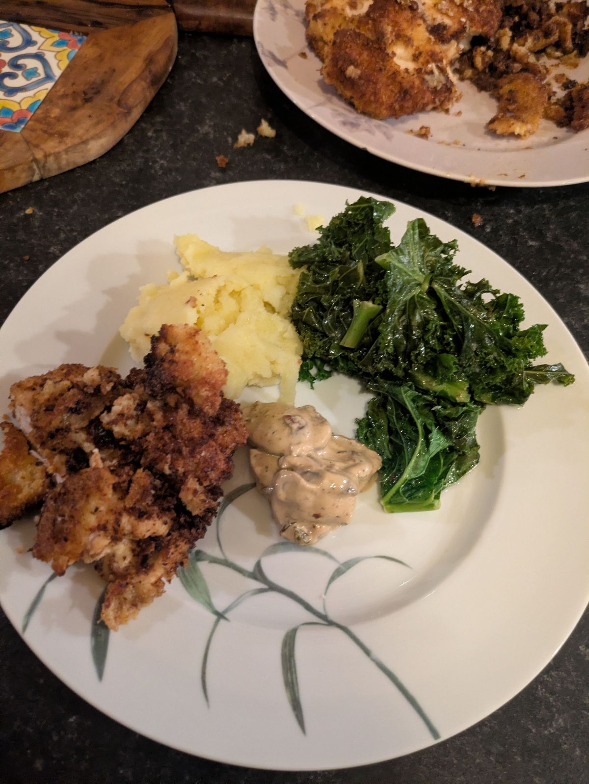 A comforting and hearty meal featuring golden-fried breaded chicken cutlets served alongside creamy mashed potatoes, sautéed curly kale, and a rich, savory mushroom cream sauce.
