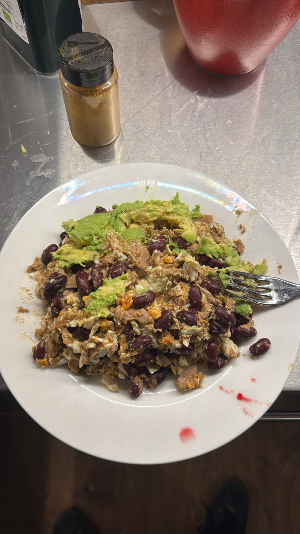 I mixed tuna, beans, eggs, avocado and garlic with hot sauce. The red on the side is my blood from cutting myself opening the can.