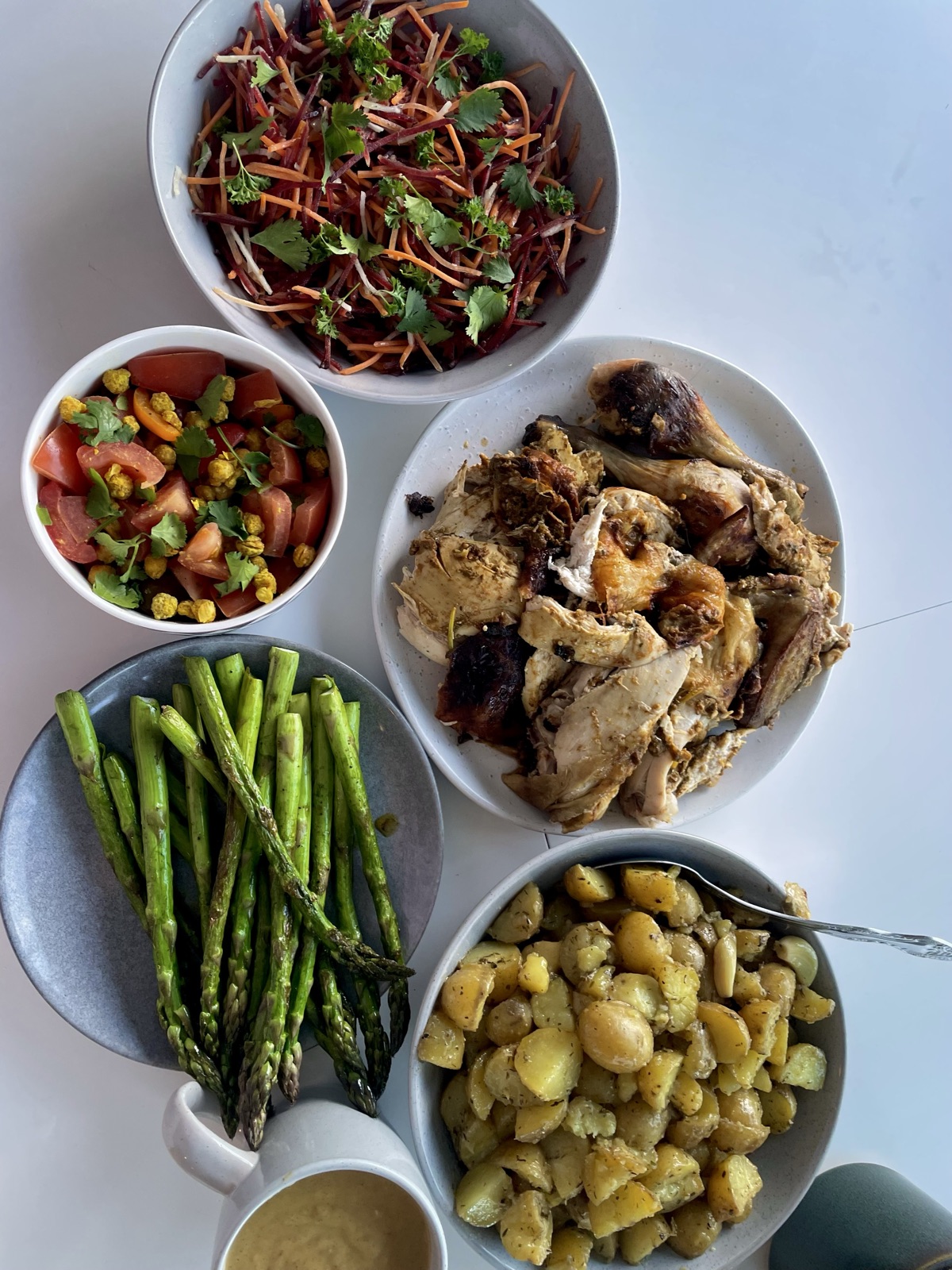 indian butter roast chicken, garlic baby potatoes, lemon geilled asparagus, tomato and crispy chickpea salad, herby slaw