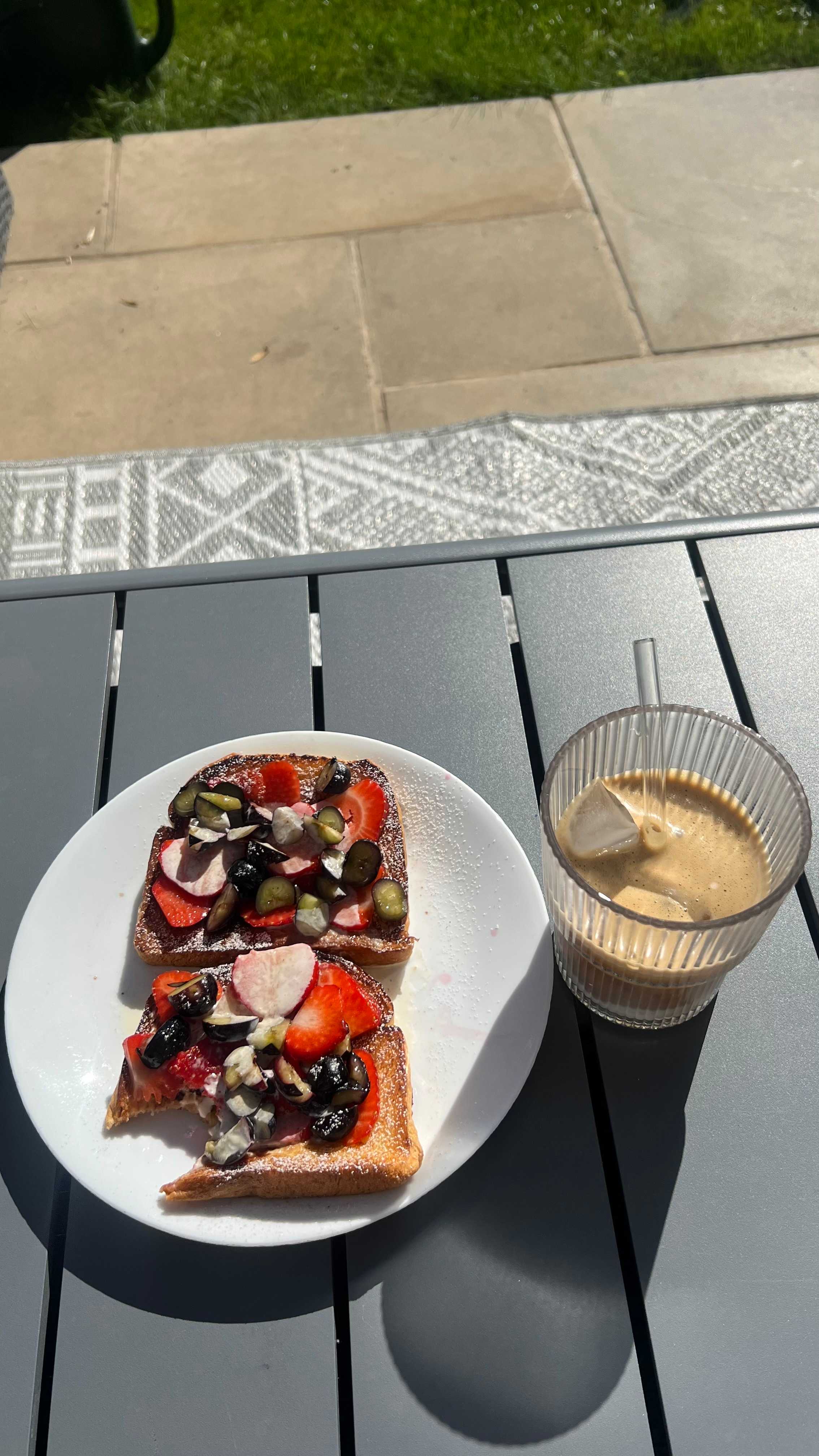 A classic sunny morning breakfast featuring thick slices of golden French toast topped with fresh strawberries, blueberries, and crunchy sliced almonds. Finished with a dusting of powdered sugar and served alongside a refreshing iced latte.